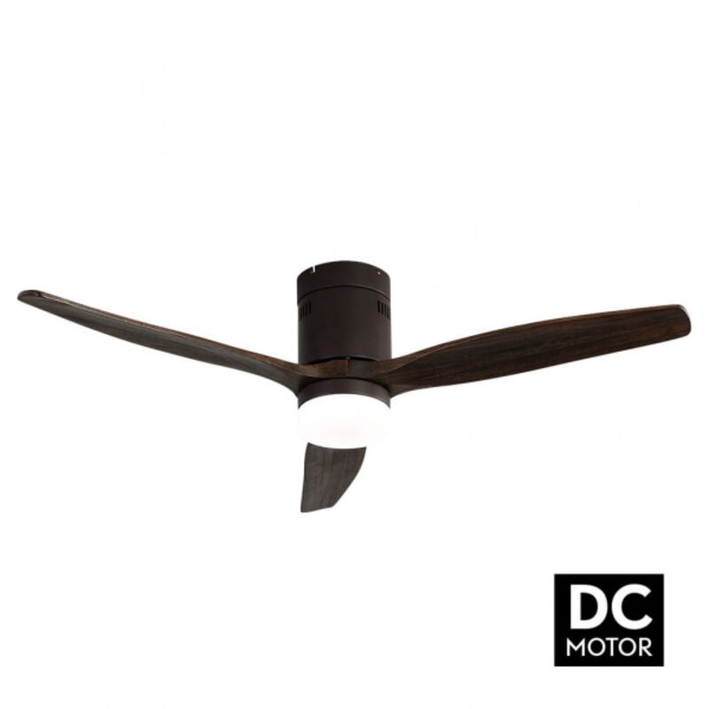 Ventilatore LED AGUILON in metallo, legno e policarbonato, colore MARRONE con tre pale in ROVERE. Motore a corrente continua. Ha cinque velocità regolabili. Tecnologia LED integrata dalla potenza di 18W, con 3 TEMPERATURE LUCE (3000-4000-6000K) e 2350
