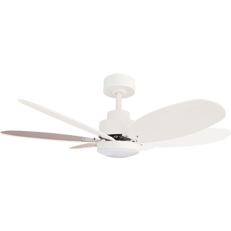 Ventilatore da soffitto con motore DC, diametro 101 cm, ideale per stanze da 14 a 20 M2. Con corpo in metallo bianco e sei lame reversibili in compensato marrone scuro/pino. Motore a corrente continua di alta qualità che consente elevate prestazioni con consumi e rumorosità minimi. Funzione estate/inverno inclusa. Viene fornito con una sorgente luminosa a LED da 18W 1800 lumen che viene controllata tramite il telecomando con un timer, che può cambiare la temperatura del colore (caldo, neutro, freddo). Dimensioni (cm): 101x34cm;