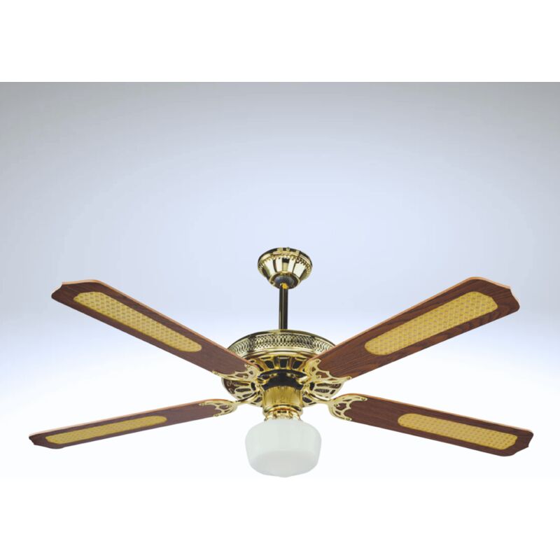 Questo ventilatore da soffitto di stile classico è l'ideale per chi cerca un arredo soffitto elegante e funzionale. Con 4 pale in legno finitura ottone e paglia, garantisce una ottima circolazione dell'aria in ogni ambiente. Facile da installare, è la soluzione perfetta per rinfrescare la tua casa durante le calde giornate estive. Alimentazione 220V/50Hz, 65 Watt Corpo ottonato 4 pale in legno con inserti in paglia 3 velocità Lampada con paralume in vetro bianco.