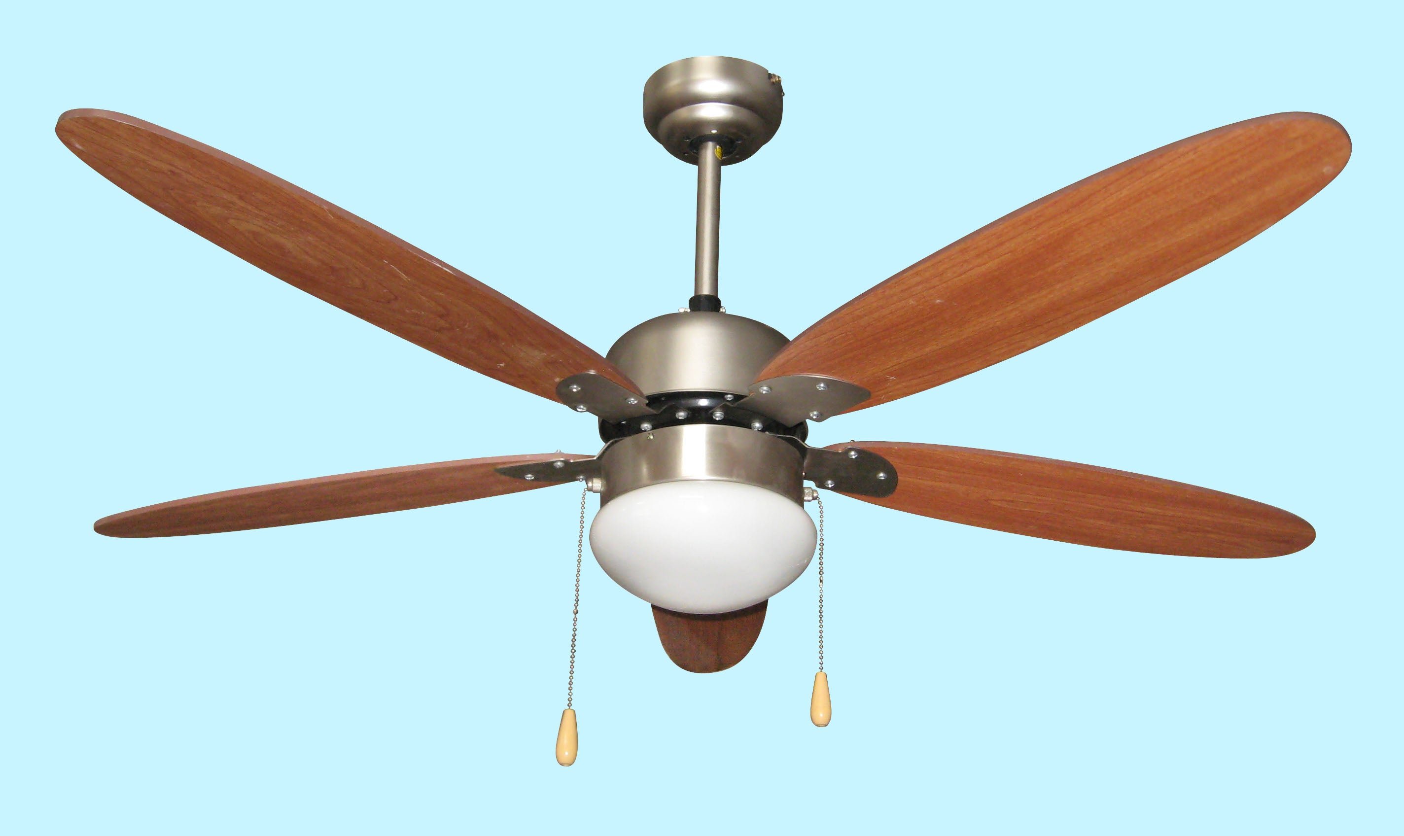 Ventilatore da soffitto 5 pale in legno, dimentro 132 cm, colore marrone, con luce 60W attaco E27, Funzione Reversibilità - comando a cordicella. Ideale per ventilare ambienti fino a m2 25. Con questo ventilatore si possono selezionare fino a 3 velocità di ventilazione, in base alle proprie esigenze. Grazie alla fiunzione reversibilità può essere utlizzato sia in inverno che in estate