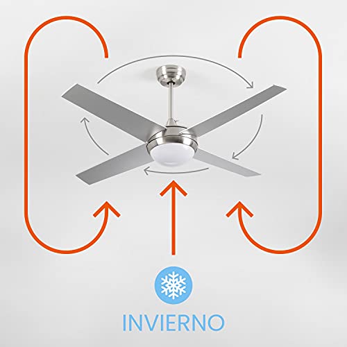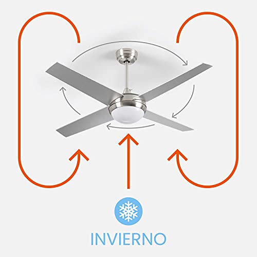 Ventilatore da soffitto con luce LED silenziosa 4 pale 56 W di potenza | modello Montana Argento di Dayron | Ventilatore da soffitto con telecomando e 6 velocità controllabili