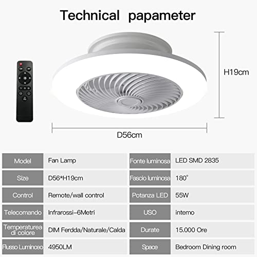 【Specifiche del prodotto】Ventilatore da Soffitto regolabile multifunzionale di alta qualità con lampada,dimensioni D56xH19cm,potenza 55W,lumen 4950LM,modalità multiple possono essere regolate e commutate a piacimento, colore dell'illuminazione ed energia eolica e sperimentare un design tecnologico controllato in modo intelligente prodotti.