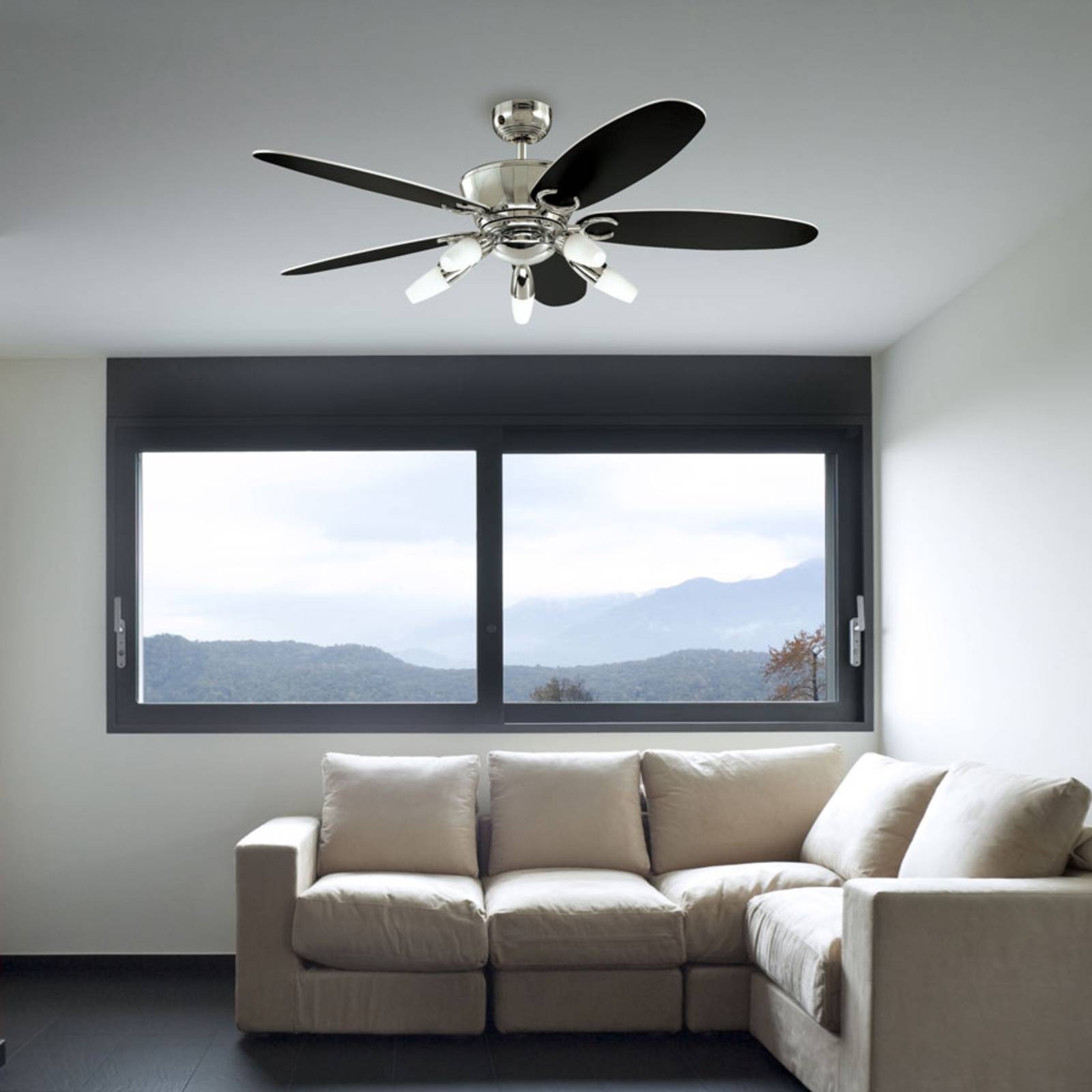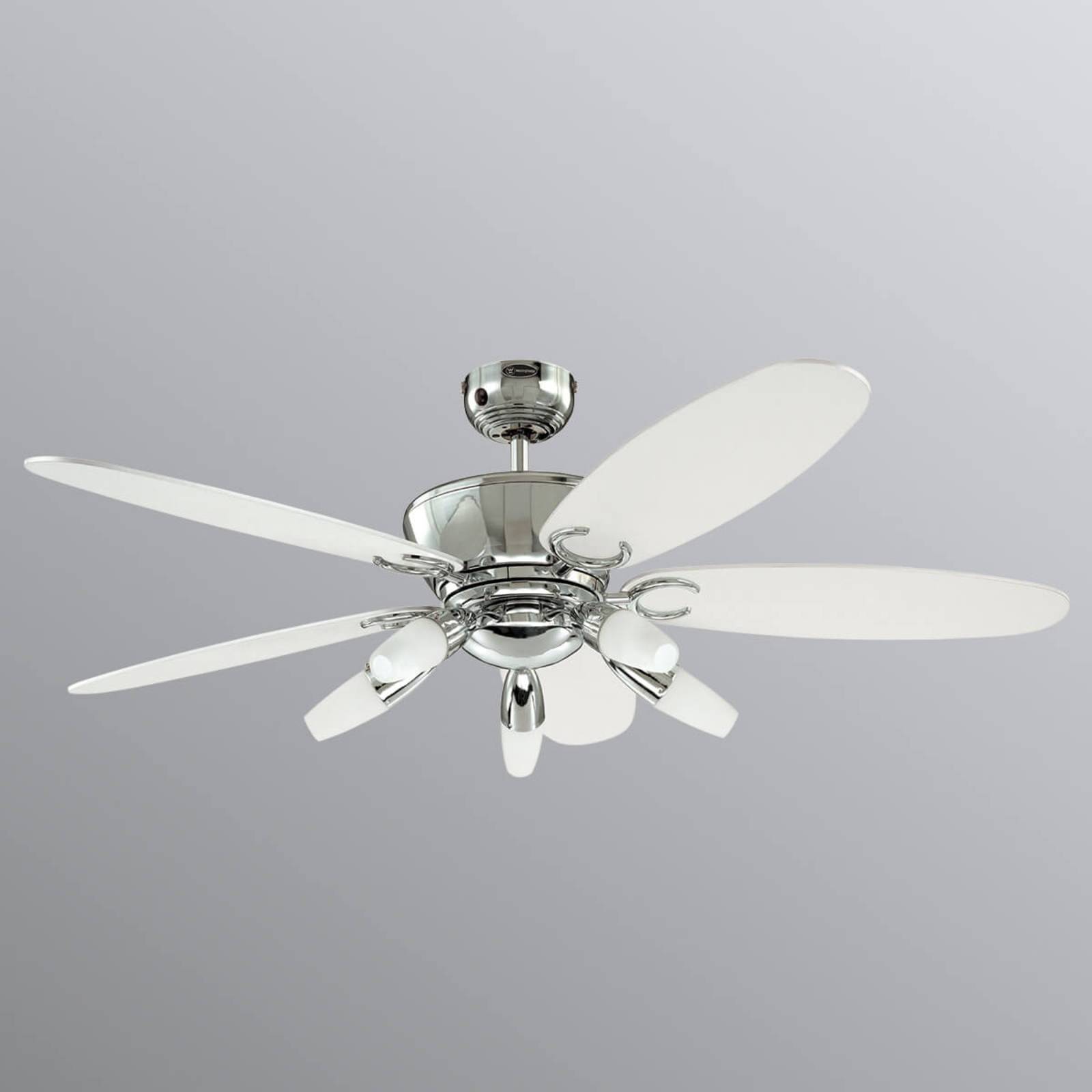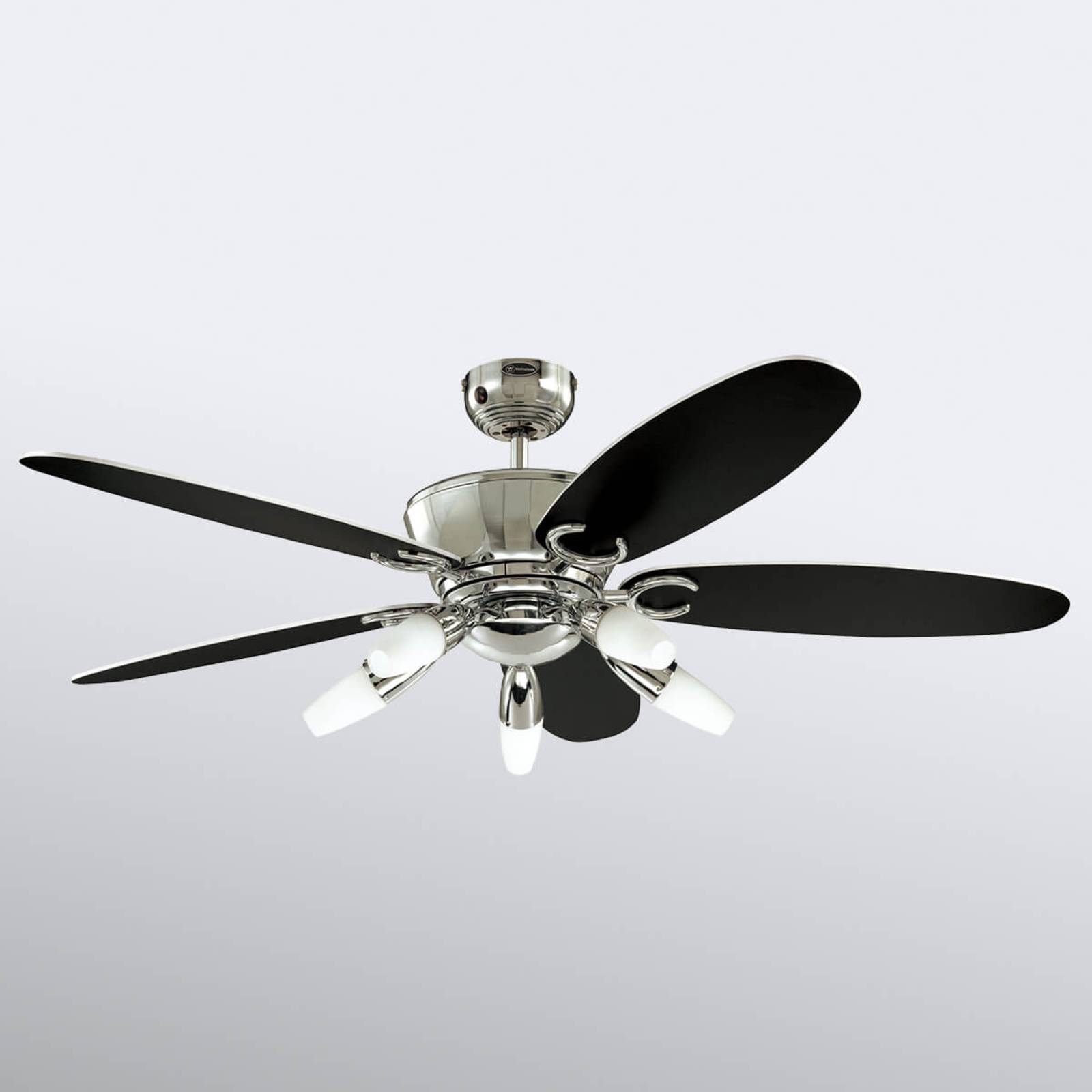 Elegante ventilatore da soffitto Arius in cromo con telecomando Il ventilatore da soffitto Arius colpisce per la sua forma a bulbo con una base aggiuntiva per il fissaggio per soffitto in un moderno colore cromo. Cinque pale reversibili impreziosiscono il design, a scelta con ottica bianca o nera. Cinque eleganti luci con paralume in vetro opalino allungato ne esaltano l'estetica. Forniscono una luce sufficiente anche in ambienti di grandi dimensioni. Sorgente luminosa: 5 x E14, tipo 3U, max. 9 W ciascuna (non incluse - possono essere acquistate tramite gli accessori) Funzioni Regolabile in tre fasi: Il deodorante per ambienti si aziona tramite il telecomando in dotazione. Se il deodorante deve essere azionato tramite un interruttore a parete, questo può essere acquistato come accessorio. A partire da un'altezza del soffitto di 350 cm, è possibile aggiungere una prolunga (vedere accessori). Sull'alloggiamento è presente un cursore per impostare la funzione avanti o indietro. Il funzionamento in avanti è una funzione estiva e fornisce un effetto di raffreddamento, mentre il funzionamento inverso è una funzione invernale e fornisce una circolazione del calore. Questo permette di ridurre i costi di riscaldamento fino a un massimo del 30%. Dati tecnici Potenza: 59/35/20 watt Velocità: 178/110/51 giri/min Caratteristiche speciali Il motore funziona in modo molto silenzioso e fluido, rendendo il ventilatore da soffitto Arius ideale per l'uso in camera da letto.