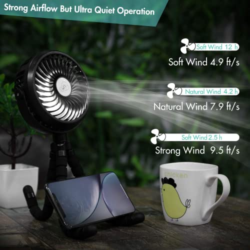 Ventilatore Versatile con Batteria da 2600mAh Flessibile Treppiede, Forte Flusso d'aria, Silenzioso Ventola USB Portatile Rotante a 360 ° per Passeggino, Tapis Roulant, Tenda, ecc.(Nero)