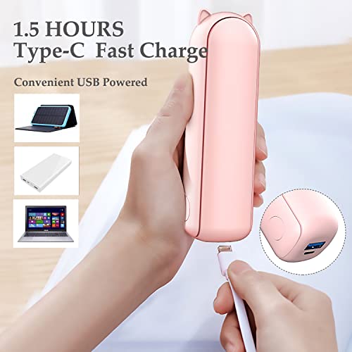 Design pieghevole e dimensioni ridotte: il design pieghevole lo rende facile da trasportare e riporre. Inoltre, con la forma della capsula (13 x 4,2 x 4,2 cm, peso: 180,9 g), questo ventilatore ricaricabile può nascondere la lama del ventilatore, piccolo e facile da scivolare in tasca e in borsa. Design leggero e adorabile a forma di animale domestico, cuore da ragazza, comodo da tenere e facile da trasportare.