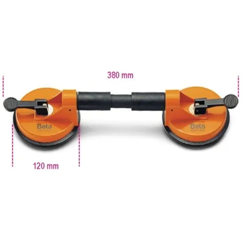 Ventosa doppia per piastrelle, cristalli e vetri Particolamente adatta per parabrezza auto Bloccaggio e rilascio delle ventose azionabile tramite leve Portata fino a 50 Kg Lunghezza 380mm Diametro ventose 120mm