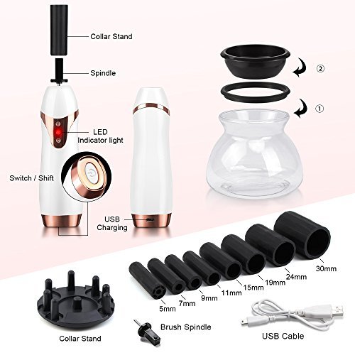 Semplice da utilizzare: per pulire i pennelli da trucco sono necessari tre semplici passi. 1. Inserisci il pennello nella centrifuga. 2. Versa acqua e sapone nel contenitore. 3. Immergi e ruota per sciacquare, ruota per asciugare. Batterie necessarie: 2 batterie AAA (non incluse nella confezione).