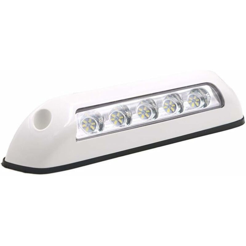 La barra luminosa del baldacchino a LED è un buon sostituto. Universale adatto per RV, ESC, RV, barca e altri apparecchi elettrici 12V DC 5 LED, colore LED: bianco, temperatura colore: 6000K. Potenza: 2,6 W Grado di impermeabilità: IP67. Temperatura ambiente di lavoro: da -40 a 65 ℃ Vite autofilettante attaccata. Vite non inclusa. Facile da installare Modalità di cablaggio: Cavo bianco: polo positivo, Cavo nero: polo negativo