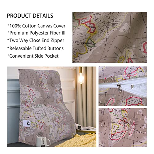 VERCART 100% Cotone Cuscino da Lettura a Forma Curva Schienale Letto Aumento Poggiaschiena Supporto Lombare Cuscino Cuneo Antireflusso Adulti Cuscini Decorativi Divano Vintage Carta Geografica 60cm