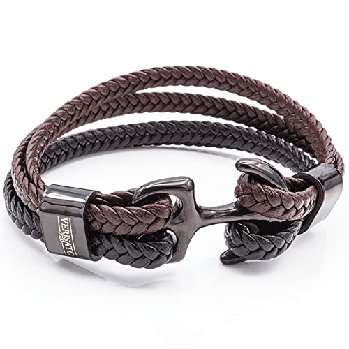 Un bracciale moderno per uomini e donne. Design semplice ed elegante con ancora nera e lacci in pelle intrecciata in marrone e nero, adatto per collana di perle o bracciale come set di gioielli
