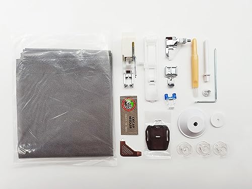 Contenuto della confezione: piedino universale/multiuso, cerniera, asola, piedino per cucire bottoni, orlo cieco, righello per bordi, piastra per ricamo e rammenda, bobine da afferrare, separatore per frecce, pennello per la pulizia, custodia antipolvere