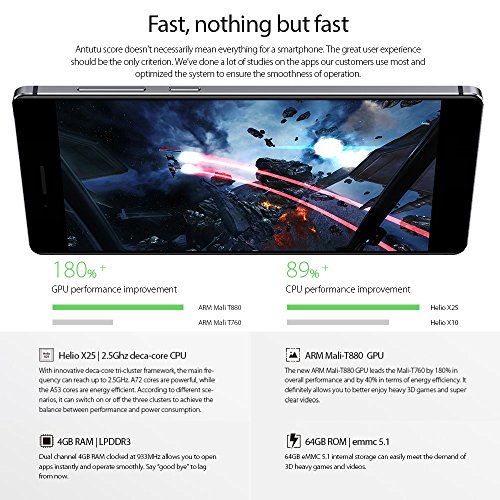 Forte potenza, CPU:Helio X25 MTK6797T, 64-bit, 2,5 GHz Deca Core, 4GB RAM + 64GB ROM (eMMC5.1), sistema Android 6.0, garantiscono esperienze di gioco velocissime e fluide.