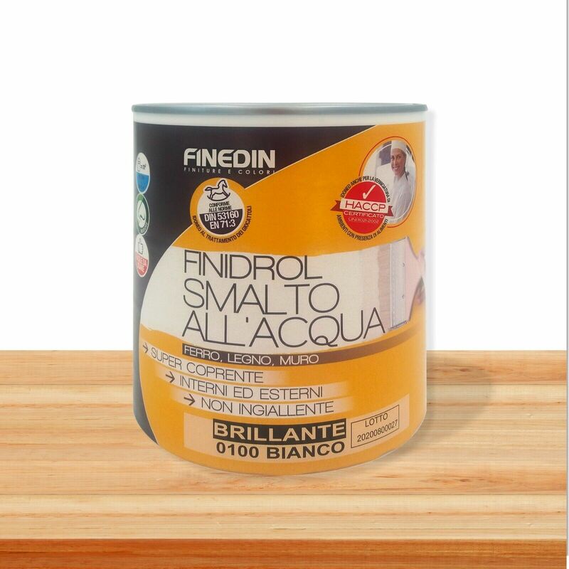 FINIDROL SMALTO ALL'ACQUA INODORE LUCIDO PER ESTERNI ED INTERNI Confezione da 0,750 Litri Descrizione: Smalto all'acqua monocomponente lucido, resistente all'ingiallimento. Prodotto idoneo per la verniciatura dei giocattoli e culle ai sensi della norma DIN EN 71:3 e DIN 53 170 (resistenza al sudore e saliva). FINIDROL è idoneo alla pitturazione di ambienti con presenza di alimenti secondo la norma UNI 11021:2002 relativa alla metodologia HACCP. (Rapporto di prova n.550/2017 rilasciato dall'Università del Sacro Cuore di Piacenza). FINIDROL rappresenta la soluzione ottimale per la pitturazione e la verniciatura di asili e scuole, cucine e mense, ambienti ospedalieri, industria alimentare, ambienti ad alta richiesta di igiene. Protegge dall azione invecchiante del tempo i supporti. Multiuso. Dotato di un solido ancoraggio e buona elasticità, si applica su fondi e smalti ad acqua e a solvente, protegge i supporti dall'azione invecchiante del tempo e conferisce nuovo aspetto. Ideale per