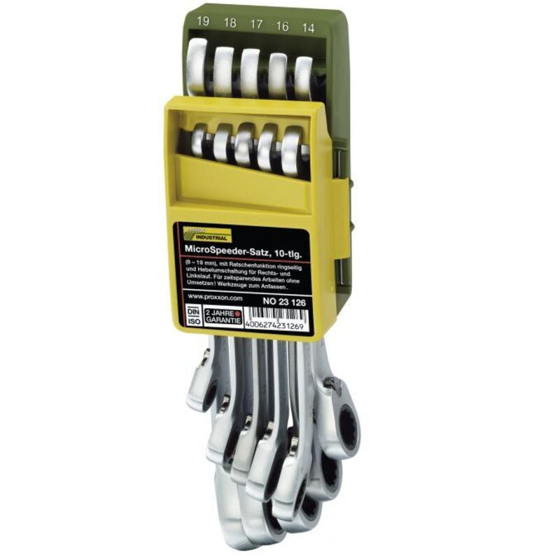 Un set di strumenti professionali PROXXON MicroSpeeder. Chiavi da 8 - 19 mm. Il set comprende SW: 8 - 10 - 13 - 16 - 17 - 18 e 19. Confezionato in una robusta scatola di metallo. Laddove non è possibile utilizzare una chiave normale, la nostra chiave mantiene la funzione a cricchetto. È azionato da un anello interno a 72 denti in acciaio altolegato con una deflessione di appena il 5%. Inoltre, le coppie raggiunte sono ben al di sopra degli standard DIN/ISO. Realizzato in acciaio al cromo vanadio, con rivestimento cromato. - MicroSpeeder con commutazione destra-sinistra e deflessione dell'anello di 15°. - Non è possibile ruotare la testa della chiave di 15 gradi. - Funzione interruttore destro e sinistro. Perfetto per fissare viti su superfici piane.