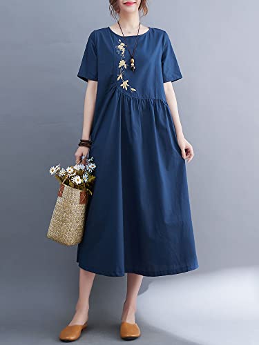 Versear Abito Longuette da Donna in Cotone Ricamato a Maniche Corte Abito Casual Casual Floreale Estivo con Tasche