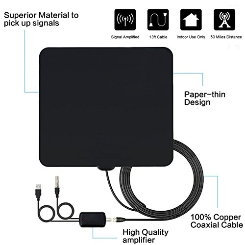 2018 Versione Aggiornata Antenna Interno TV, 50 Miglia Range TV Antenna per DTT DVB-T/ DVB-T2 per TV con Digitale, Antenna HDTV con Amplificatore di Segnale Avanzato e Cavo Coassiale da 13FT, Super Sottile Ricevere VHF/UHF/FM