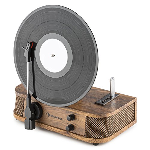 Auna Verticalo S • lettore con altoparlante • giradischi • piastra verticale • trasmissione cinghia • disco magnetico • porta USB MP3 compatibile • linea uscita jack • sistema di presa • marrone