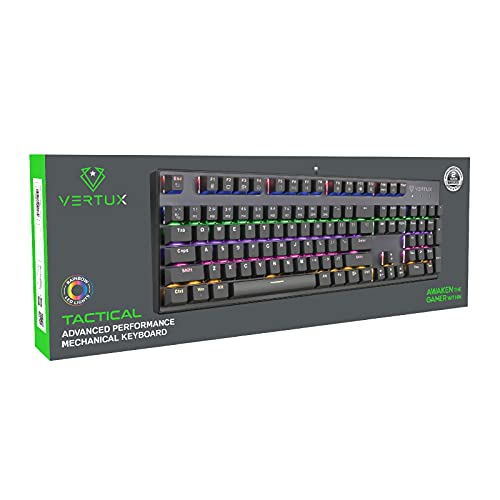Vertux Tactical, tastiera da gioco RGB LED, tastiera meccanica cablata USB e interruttori blu, 104 tasti anti-ghosting, 12 tasti di scelta rapida multimediali