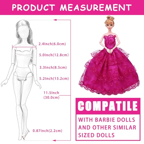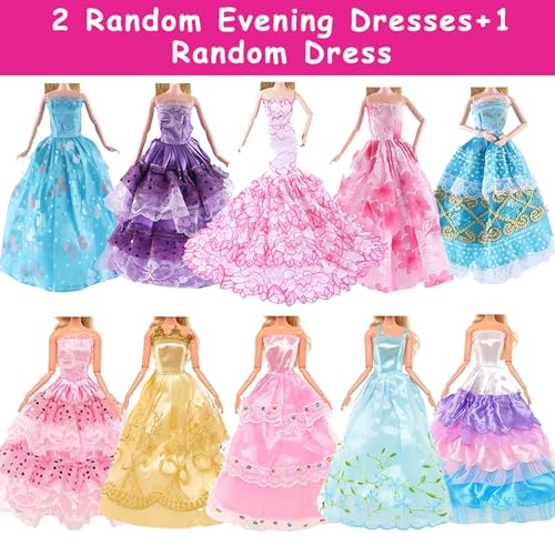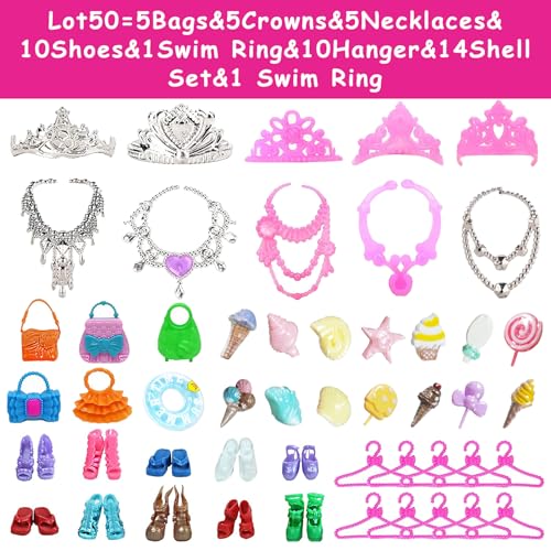 Il set vestiti comprende 14 pezzi di vestiti e accessori + scarpe 10 + collana 5 + corona 5 + borsa 5 + anello da bagno 1 + gruccia 10 + set di conchiglie 14. vestiti ha abbastanza stili per soddisfare le esigenze di abbigliamento delle amanti delle bambole.