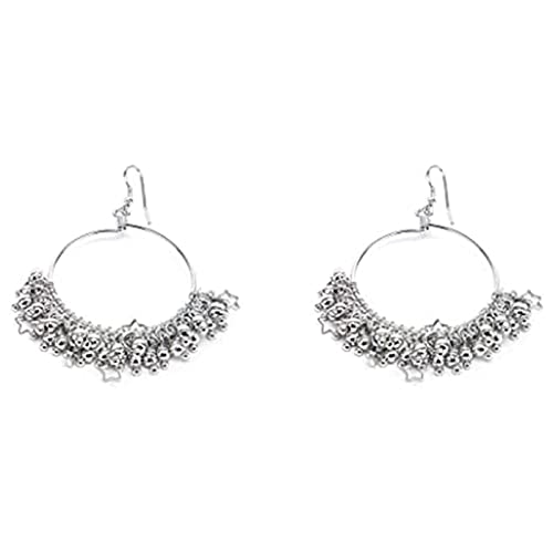 Orecchini a cerchio grande con micro pendenti a forma di stella forata e sfera. Lavorazione artigianale.
