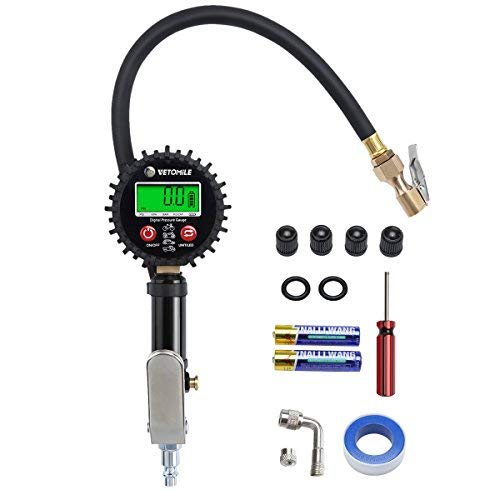 VETOMILE Manometro Digitale per Pneumatici 200 PSI con Estensore Valvola e Manichetta in Gomma Mandrino Pneumatico per Camion Auto Moto e Biciclette Nero