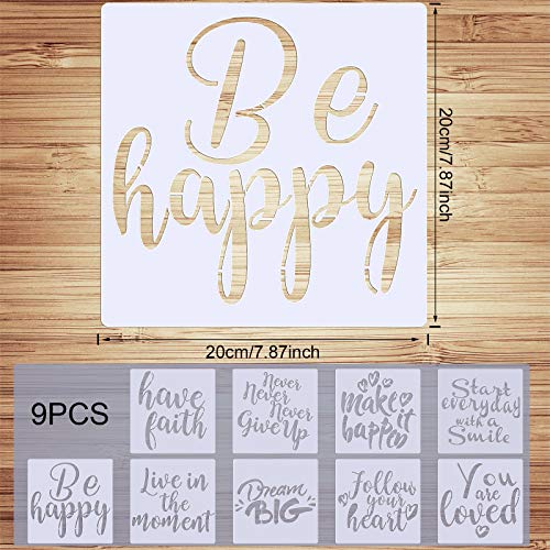 VETPW 9 Pezzi Ispiratori di Parole Riutilizzabile Pittura Stencil Set, Plastica Disegno Pittura Stencil DIY Pittura Template Stencil per Pavimenti, Finestre, Mobili, Legno, Design a Parete, 20x20CM