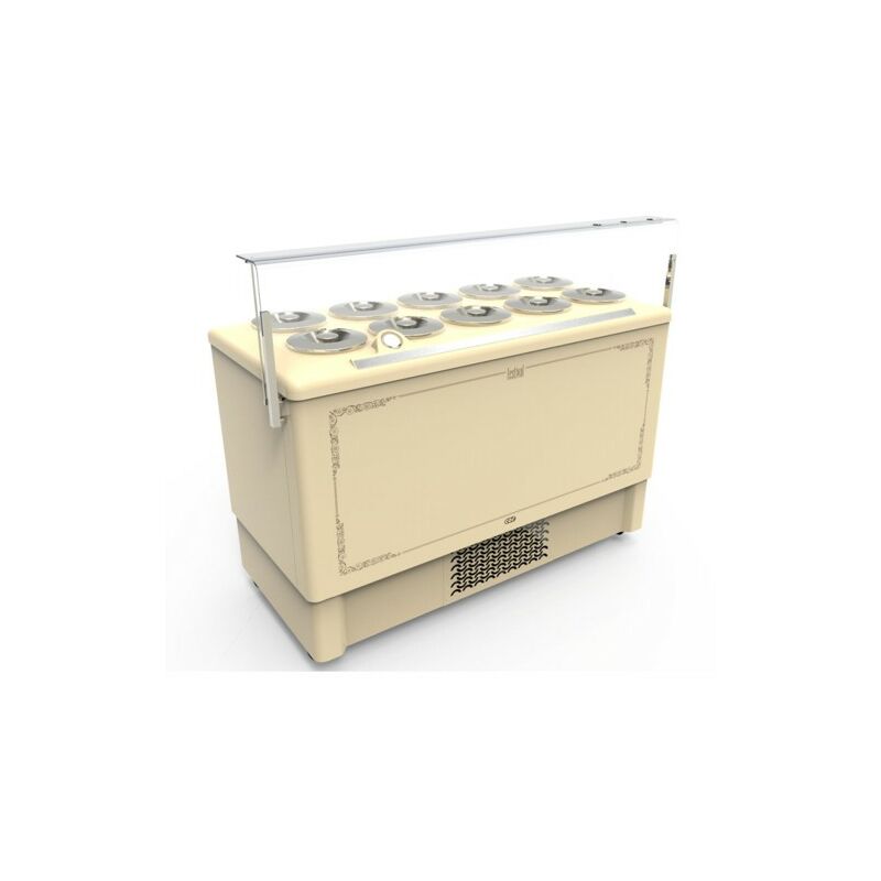 Codice RS9439 - Vetrina gelato modello CF-FESTIVAL 10, dimensioni cm. 143.9x68.4x100.8 (lxpxh), temperatura di esercizio -5/-20°C, 230 volt, 290 watt, capacità carapine 10+10 (diametro cm.20x25h - lt.7.3 cad). Mobile e zoccolo in lamiera preverniciata beige e top in plastica beige. Sbrinamento manuale, refrigerazione statica con agitatore, quadro comandi elettronico. Il sistema a carapine è una filosofia di conservazione e vendita del gelato mantecato che riconduce alla tradizione, quando il gelato era prodotto in carapine cilindriche d'acciaio che poi venivano riposte in conservatori a pozzetto. Ora si è riscoperto il desiderio di avere prodotti artigianali, naturali e biologici. Risparmio energetico: consuma -60% rispetto ad una vetrina ventilata e -40% rispetto ad una vetrina statica a parità di capacità. In caso di black-out può conservare per alcune ore il gelato, non fattibile nelle vetrine ventilate. Sistema ottimale per la conservazione del gelato in quanto le caratteristiche