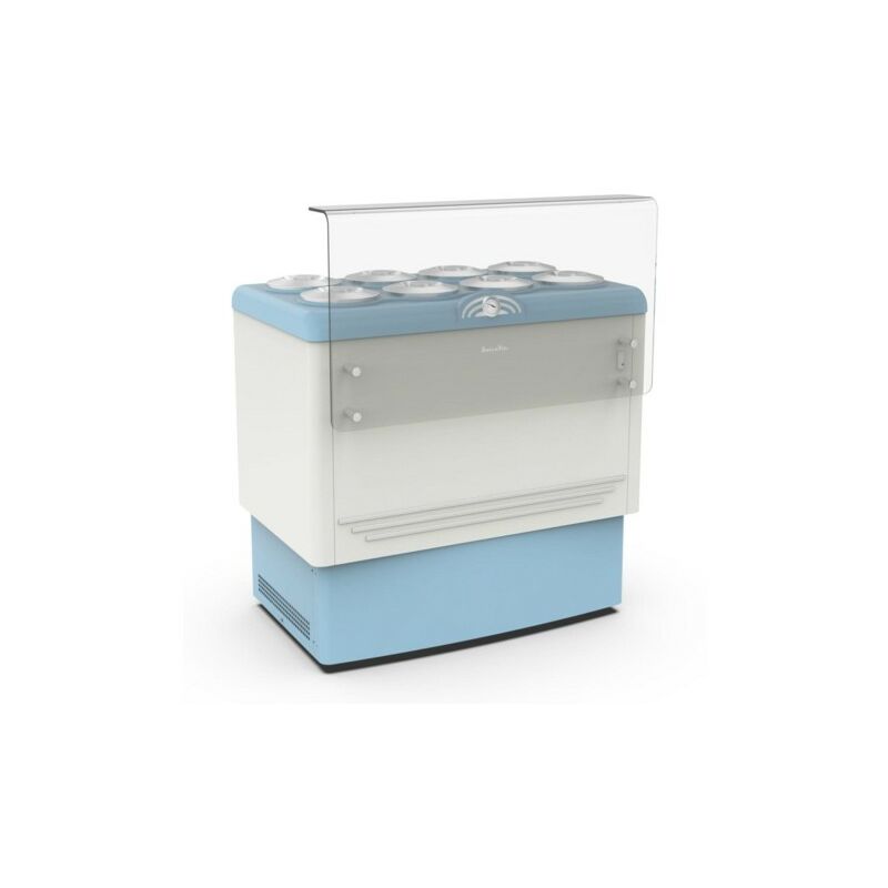 Codice RS2117 - Vetrina gelato modello MG-DOLCE VITA 8, dimensioni cm. 110.5x71.3x103 (lxpxh), temperatura di esercizio -5/-20 °C, 230 volt, 350 watt, capacità carapine 8+8 (diametro cm.20x25h - lt.7.3 cad). Finitura: mobile e zoccolo in lamiera plastificata bicolore (bianco e celeste), piano di lavoro in plastica color celeste. Il sistema a carapine è una filosofia di conservazione e vendita del gelato mantecato che riconduce alla tradizione, quando il gelato era prodotto in carapine cilindriche d'acciaio che poi venivano riposte in conservatori a pozzetto. Ora si è riscoperto il desiderio di avere prodotti artigianali, naturali e biologici. Dolce Vita è una gamma di frigoriferi che sposa questa filosofia pur adottando le più avanzate tecnologie. Risparmio energetico: Dolce Vita consuma -60% rispetto ad una vetrina ventilata e -40% rispetto ad una vetrina statica a parità di capacità. Dolce Vita, in caso di black-out, può conservare per alcune ore il gelato mentre nelle vetrine
