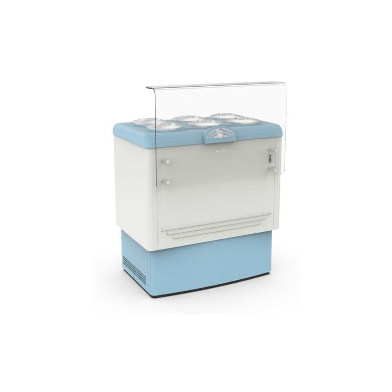 Codice RS3026 - Vetrina gelato modello MG-DOLCE VITA 6, dimensioni cm. 96.5x66.5x103 (lxpxh), temperatura di esercizio -5/-20 °C, 230 volt, 310 watt, capacità carapine 6+6 (diametro cm.20x25h - lt.7.3 cad). Finitura: mobile e zoccolo in lamiera plastificata bicolore (bianco e celeste), piano di lavoro in plastica color celeste. Il sistema a carapine è una filosofia di conservazione e vendita del gelato mantecato che riconduce alla tradizione, quando il gelato era prodotto in carapine cilindriche d'acciaio che poi venivano riposte in conservatori a pozzetto. Ora si è riscoperto il desiderio di avere prodotti artigianali, naturali e biologici. Dolce Vita è una gamma di frigoriferi che sposa questa filosofia pur adottando le più avanzate tecnologie. Risparmio energetico: Dolce Vita consuma -60% rispetto ad una vetrina ventilata e -40% rispetto ad una vetrina statica a parità di capacità. Dolce Vita, in caso di black-out, può conservare per alcune ore il gelato mentre nelle vetrine