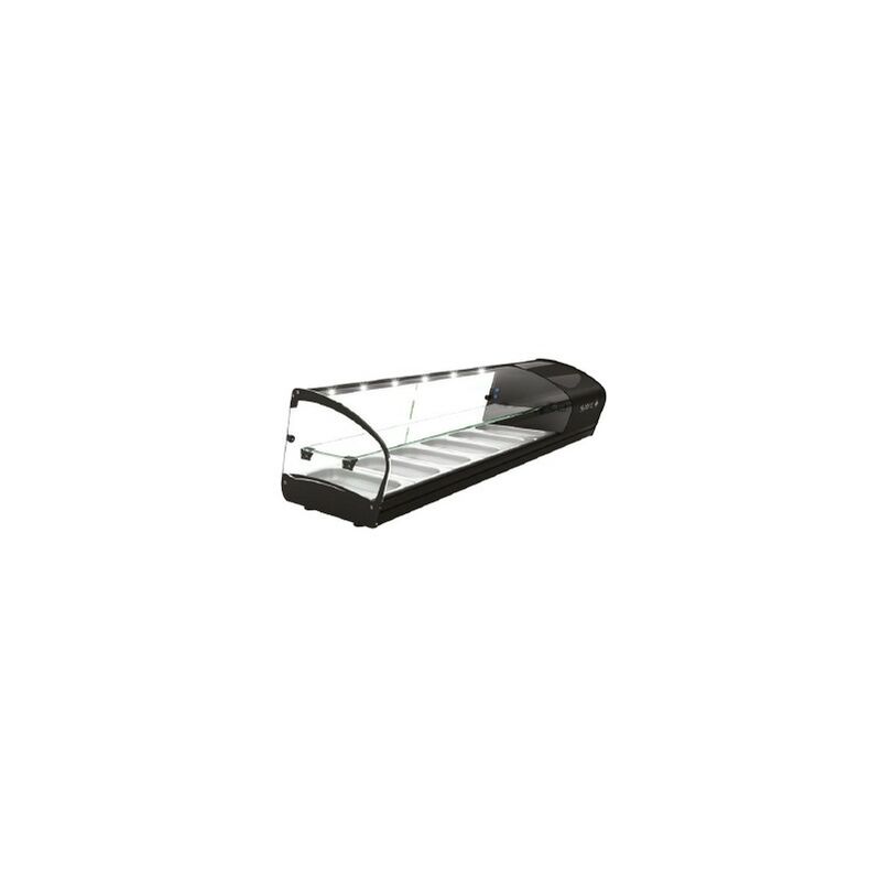 Codice RS5341 - Vetrina refrigerata da banco, modello HC-SK28, dimensioni cm. 178.8x39.5x34 (lxpxh), capacità n.8 contenitori GN1/3 h.40 mm (di serie), temperatura di esercizio +2/+5°C, 230 volt, 165 watt, peso 42 kg. Espositore refrigerato di pregevole design con struttura in metallo colore nero, cristallo curvo frontale temperato e ripiano intermedio. Costruito con le più elevate caratteristiche tecniche presenti sul mercato. Lettura della temperatura tramite termometro digitale. Sistema di illuminazione di ultima generazione con led ad alta potenza con luce fredda a basso consumo. Porte scorrevoli lato operatore, ripiano centrale in cristallo e parte frontale ribaltabile per una facile pulizia.