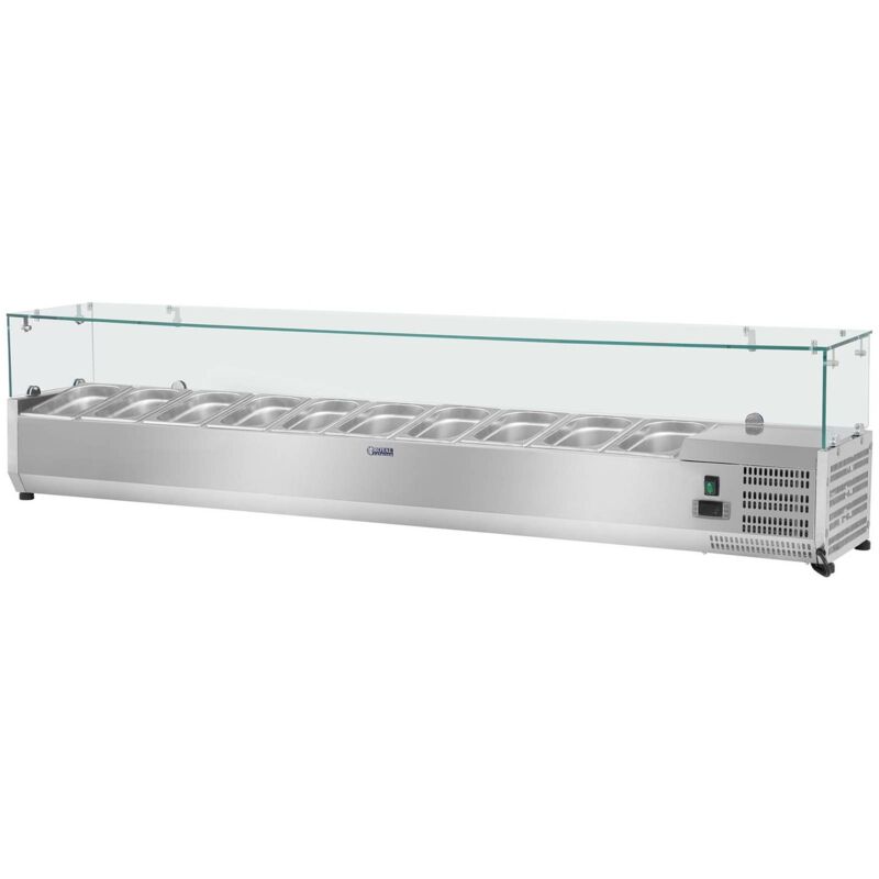 Vetrina refrigerata - 200 x 33 cm - 10 contenitori GN 1/4 - Copertura in vetro La vetrina refrigerata RCKV-200/33-10 di Royal Catering assicura alimenti freschi e dall'aspetto accattivante, poiché li mantiene e li conserva al fresco, sia per servirli che per sottoporli a lavorazioni successive. Questo refrigeratore professionale di Royal Catering è stato concepito per ristoranti, caffè, gelaterie, bar a servizio rapido, hotel e molto altro. Un prodotto di inestimabile valore anche per pizzerie e salad bar.