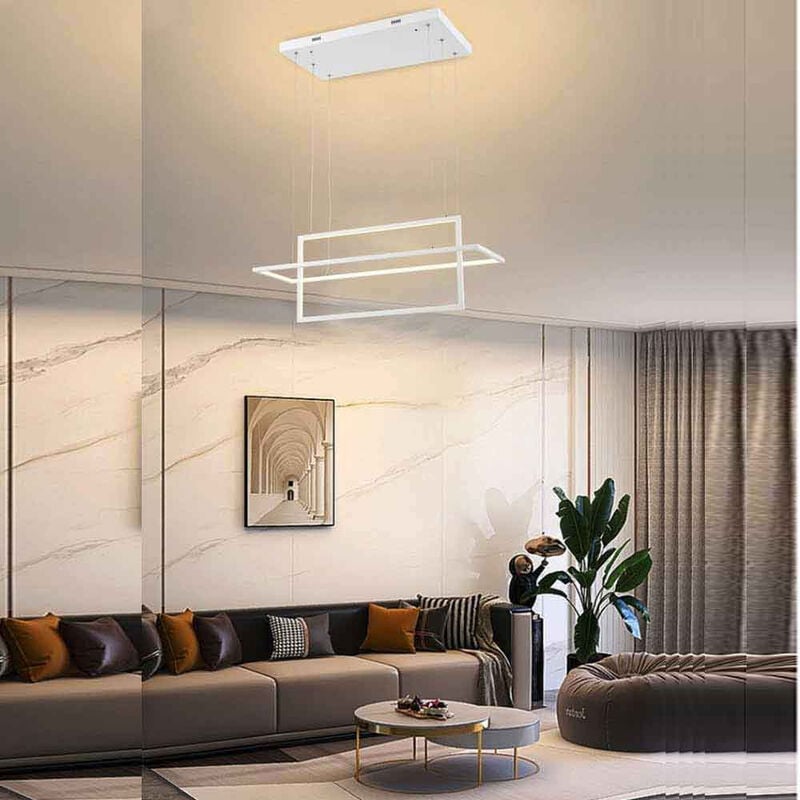 Arte e design si fondono dando vita a questo particolare lampadario led a sospensione, stile geometrico, composto da 2 rettangoli regolabili in altezza in base alle proprie esigenze. Con un'emissione di luce potente è ideale per l'illuminazione di ambienti interni come salotti, soggiorni, cucine e camere da letto. Ogni rettangolo misura nello specifico: 850x250x18 mm - 600x300x18 mm e ognuno è caratterizzato da una luce continua sul bordo interno. Potenza 56 watt Tensione 220-240v 50/60hz Flusso luminoso: 4480Lm Fascio luminoso 240° Gradi kelvin: Luce naturale 4000k. Colore bianco Materiale: alluminio e PVC Grado protezione IP20 Dimensione totale: 1500x800x250 mm Base soffitto: 600x300x35 mm Lunghezza fili circa 120 cm Peso 2.8 Kg