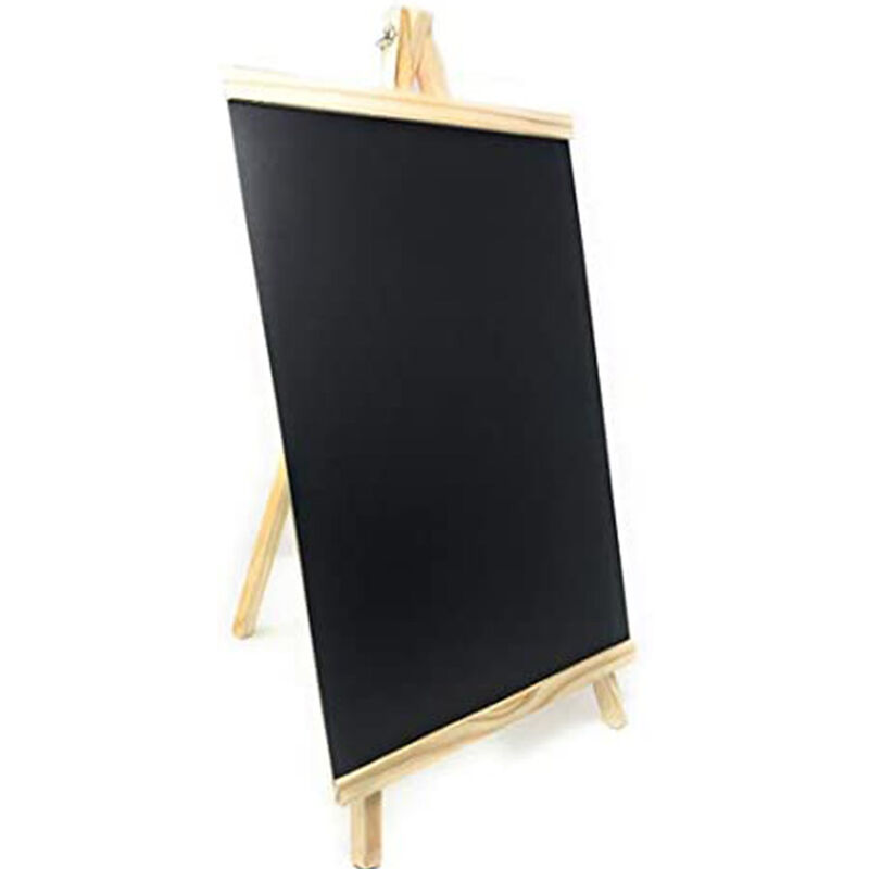 Lavagna in ardesia con cavalletto treppiede in legno. Il cavalletto è richiudibile per evitare ingombri quando non utilizzato. Ideale per stimolare la creatività dei bambini oppure per scrivere messaggi promozionali da utilizzare in ristoranti, bar, negozi. Composta da una superficie scrivibile in ardesia con gessetti (non inclusi) Dimensioni 30x60 cm Superficie scrivibile 43x30 cm