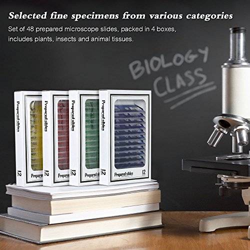 Set di 48 vetrini per microscopio preparati, confezionati in 4 scatole, include piante, insetti e tessuti animali.