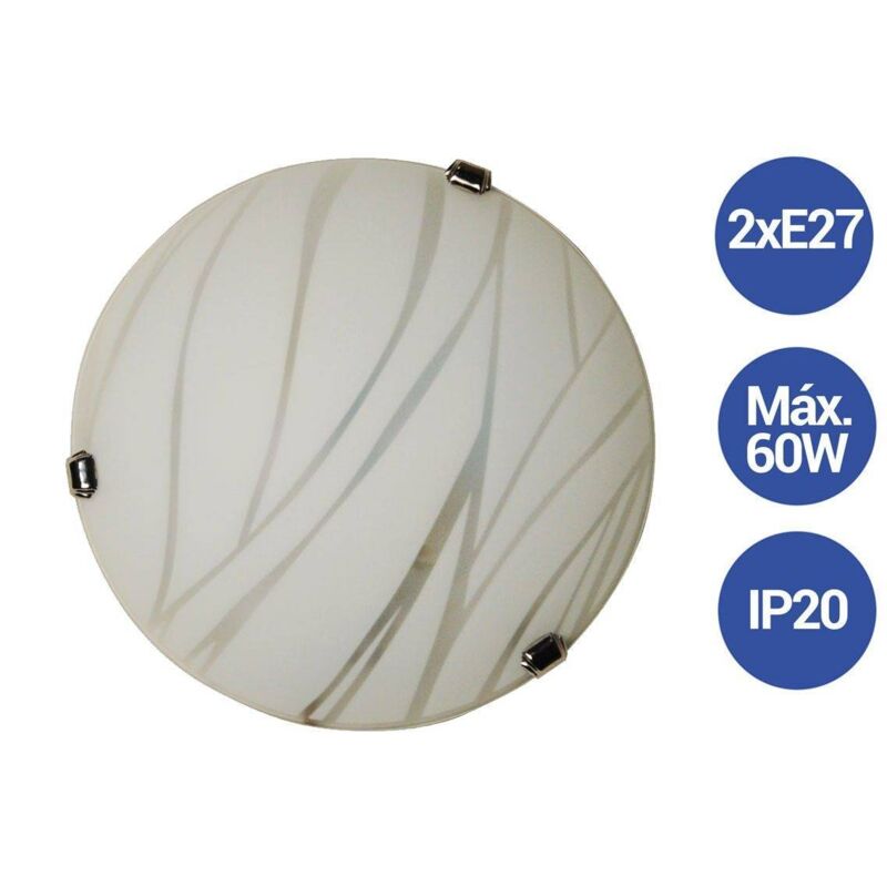 Applique in vetro Luna. A forma di luna, rotondo ed elegante. Con linee che si estendono su tutta la copertura in vetro. Questa lampada da parete può essere collocata ovunque in ambienti interni. Coperchio in vetro smerigliato traslucido, tenuto in posizione da tre alette metalliche. Due prese E27 con una potenza massima di 60W ciascuna. Misure Ø300X80mm. **NON INCLUDE LE LAMPADINE E27**. 230V/AC 2xE27 Ø300X80mm IP20