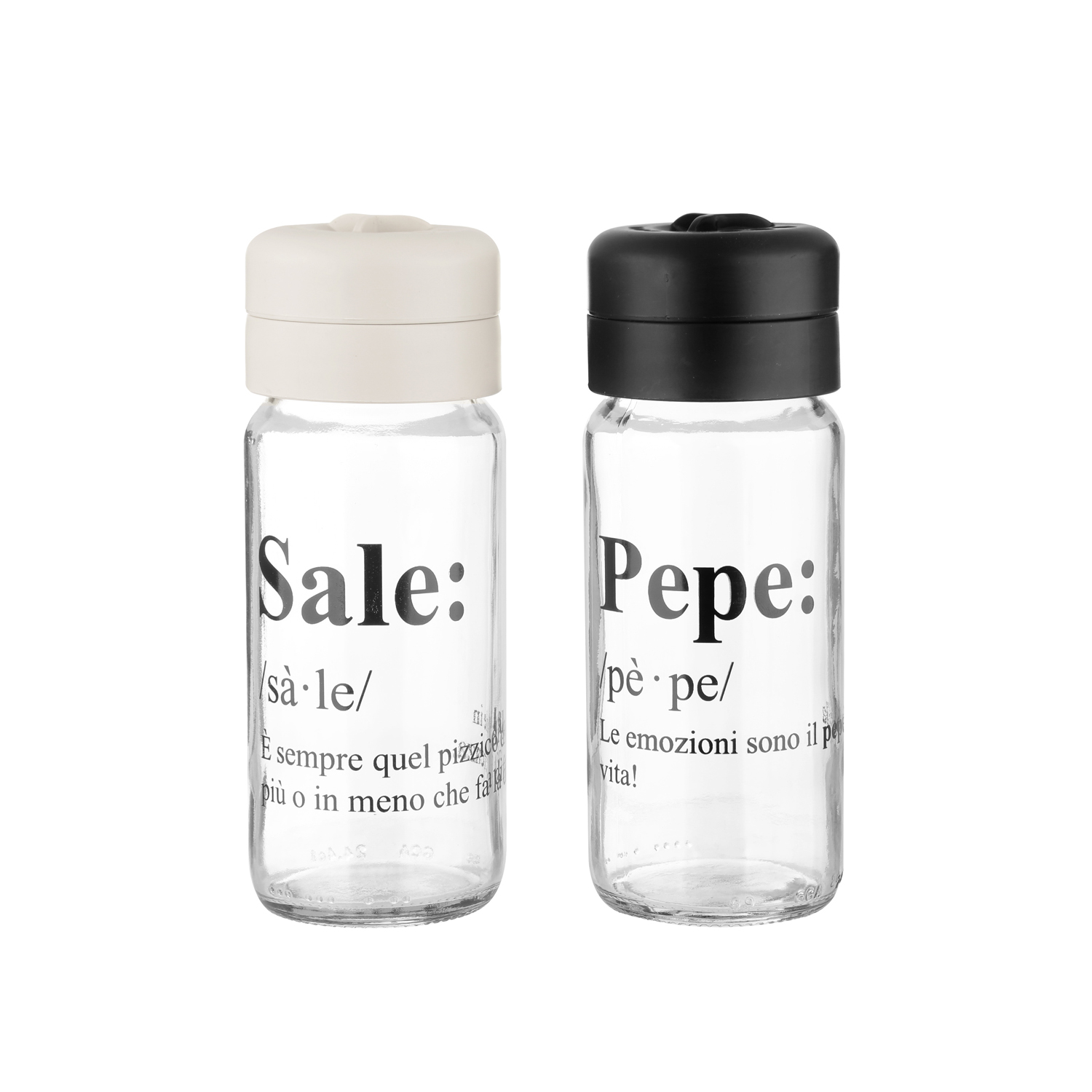 Porta in tavola un tocco di allegria con questo pratico set in vetro per sale e pepe con frase a stampa. Il design essenziale, e il contrasto tra corpo trasparente e dettagli scuri, sono in pieno stile moderno, che unisce eleganza e un pizzico di ilarità, per vedere sempre il lato brillante della vita, soprattutto a tavola!
