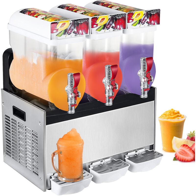 Macchina per Granita 3 Vasche Qui ti offriamo la migliore macchina per slushie ad alte prestazioni. 3 * 15 L di capacità, comodo e semplice da usare. È dotato di un compressore premio con un condensatore in rame pieno, con raffreddamento rapido, risparmio energetico e basso rumore. Grazie alle vaschette antigoccia rimovibili, è facile da pulire. Adatto sia per uso commerciale che domestico. Nota: Lo zucchero è essenziale quando si utilizza la macchina per bevande e non si usa solo l'acqua durante la procedura. Il contenuto di zucchero non deve essere inferiore al 13% con il saccarosio e inferiore al 22% con il maltosio. Nel frattempo, dopo aver ricevuto la macchina, è meglio usarla 24 ore dopo. Qualità avanzata Macchina da 45 litri Area di controllo precisa Utilizzo senza problemi Caratteristiche & Dettagli Macchina Granita da 45L: con 3 serbatoi (15 L / 4 US Gal per serbatoio), questa macchina per fanghiglia congelata può contenere un gran numero di granite. Evaporatori in acciaio