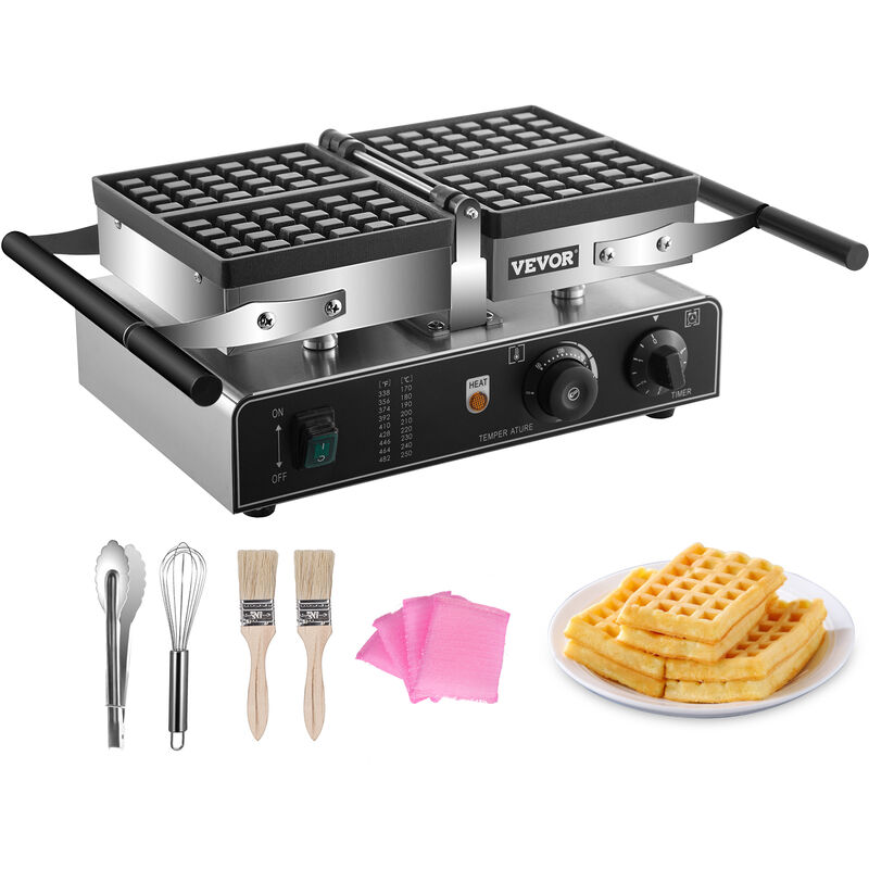 Macchina per Waffle Rettangolari da 2 Pezzi La macchina per waffle da 1600 W è la scelta ideale per uso domestico e commerciale, riscaldando prontamente e cuocendo in modo uniforme. Le manopole regolabili di temperatura e di tempo sono dotate sulla base per controllare con precisione il processo di cottura. Il corpo realizzato in acciaio inossidabile resistente e piastra di rivestimento antiaderente, la macchina è costruita per lungo uso ed è facile da pulire. Integra anche dettagli premurosi e verrà fornito con accessori completi. Doppie Piastre di Cottura Girevoli Materiale Resistente e Costruzione Sicura Controllo Preciso di Temperatura e Tempo Dettagli Designati Caratteristiche & Dettagli Piastra di Cottura Girevole a 2 Lati: Alimentata dall'alta potenza di 1600W e dotata di piastre parallele, la macchina commerciale per cialde belghe ha un riscaldamento rapido e uniforme durante il processo di cottura. Si può preparare due pezzi di waffle rettangolari alla volta. Si raccomanda di