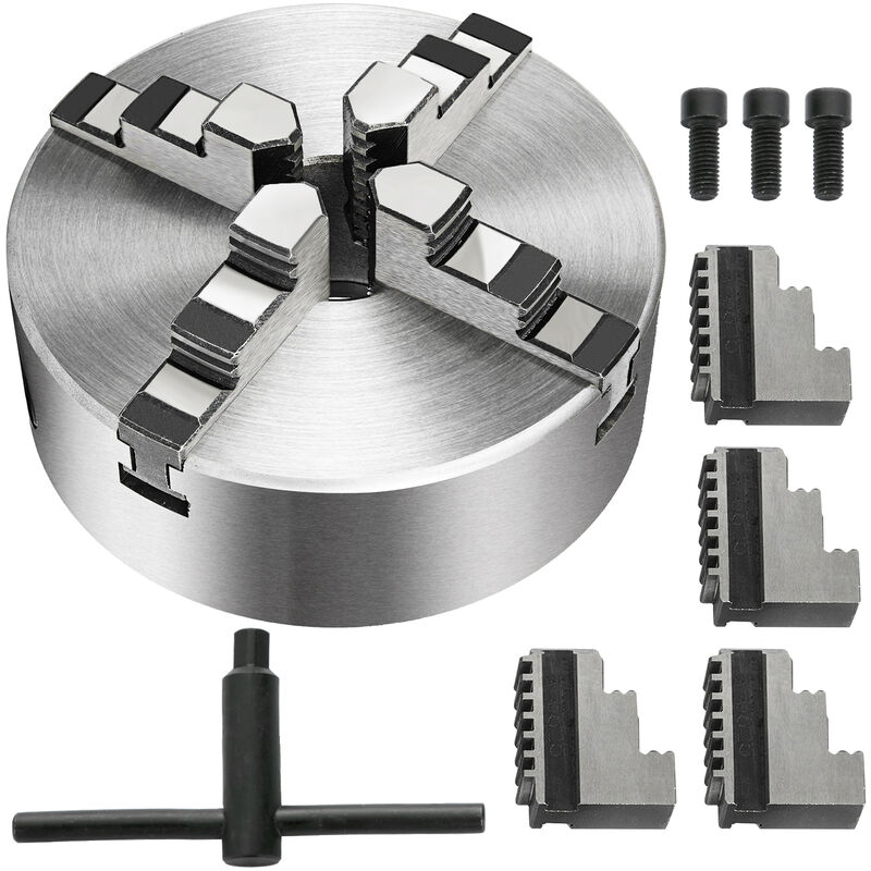 Mandrino per Tornio a 4 Ganasce da 6,3" con Due Set di Ganasce Autocentrante e Precisione di 0,002" e 4 Griffe Extra Questo versatile mandrino per tornio è realizzato in acciaio temprato di alta qualità, resistente alla compressione e ha una lunga durata. Questo mandrino è una connessione conica corta con elevata precisione di centraggio, buona rigidità e sbalzo ridotto. Questo mandrino a scorrimento ha due serie di ganasce interne ed esterne, che possono contenere parti industriali nell'intervallo 0,12" - 6,3" / 3 - 160 mm. Il mandrino a 4 griffe ha un ampio campo di serraggio e una forte forza di serraggio ed è adatto per parti industriali con forme complesse. Costruzione di qualità Alta precisione 2 Set di ganasce Ampio campo di serraggio Alta adattabilità Caratteristiche principali Costruzione di Qualità: il corpo del mandrino del tornio è realizzato in acciaio temprato di alta qualità, diversi test di qualità rigorosi lo hanno dimostrato. Le parti soggette ad usura sono