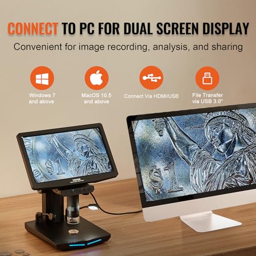 Connessione al PC per Doppia Visualizzazione: il microscopio digitale può essere collegato al PC per ottenere una visualizzazione ampliata, fornendo immagini e video più grandi e di migliore qualità per una più semplice condivisione e analisi dei dati. È compatibile con Windows 7 e versioni successive e MacOS 10.5 e versioni successive. Non è necessario scaricare alcun software aggiuntivo. Può anche essere collegato a qualsiasi TV o monitor dotato di porta HDMI.