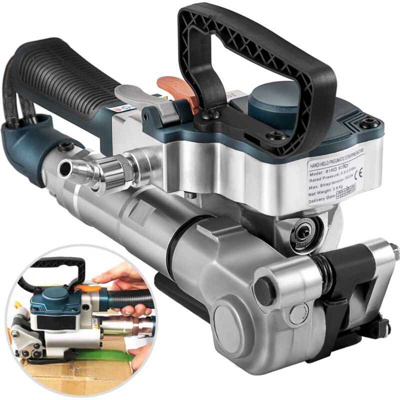 Strumento di reggiatura pneumatica portatile B25 Questo strumento di reggiatura pneumatica portatile è azionato dal motore pneumatico a basso rumore e tensione, sigillando e tagliando pneumaticamente una volta. Ha una grande forza di serraggio e saldatura termica ad attrito. La struttura del corpo in lega di alluminio ad alta resistenza e affidabilità può essere utilizzata per lungo tempo. Di piccole dimensioni e leggera, la pressa per balle per reggette è facile da maneggiare. La cerchiatrice è perfetta per imballare prodotti di grandi dimensioni in vari settori. Caratteristiche Elevata resistenza e durata Il corpo e i componenti principali dello strumento di reggiatura sono realizzati con materiali in lega di alluminio ad alta resistenza con tecnologia di produzione avanzata. È durevole e resistente. Pompa efficace e 19-25 mm Trascinato da un grande cilindro pneumatico, il tenditore di reggette poli offre una tensione di 3500N (Max). La cintura è fusa dal calore prodotto dal