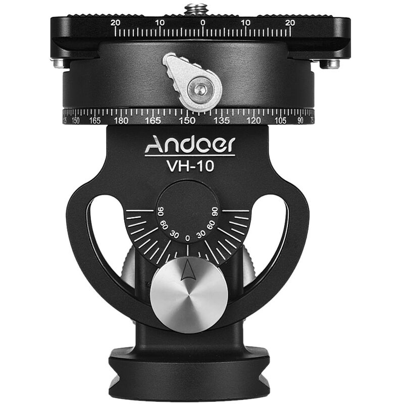 La testa del treppiede in lega di alluminio Andoer VH-10 è un eccellente aiuto per le riprese panoramiche e per il birdwatching. Supporta il movimento di panoramica a 360° e +/-90° di inclinazione. Il processo è molto fluido. Movimento di rotazione a 360° e +/-90° di inclinazione, aiuto ideale per la fotografia panoramica e il birdwatching. Il processo di rotazione è rapido e fluido;
