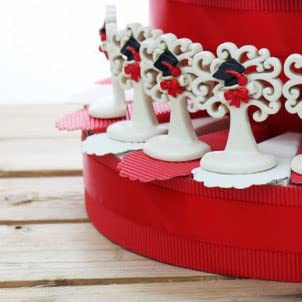 Composizioni INEDITE di Torte Bomboniere Laurea a piani confezionate con nastri e fiocchi abbinati e un simbolico CakeTopper raffigurante il Tocco adagiato su un Libro Rosso. Tutto fatto a mano per un ALLESTIMENTO davvero magico.