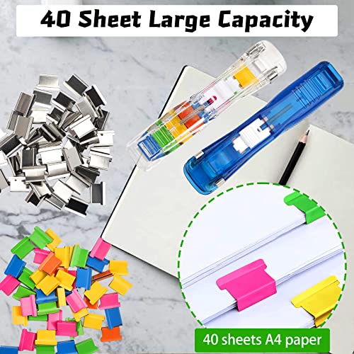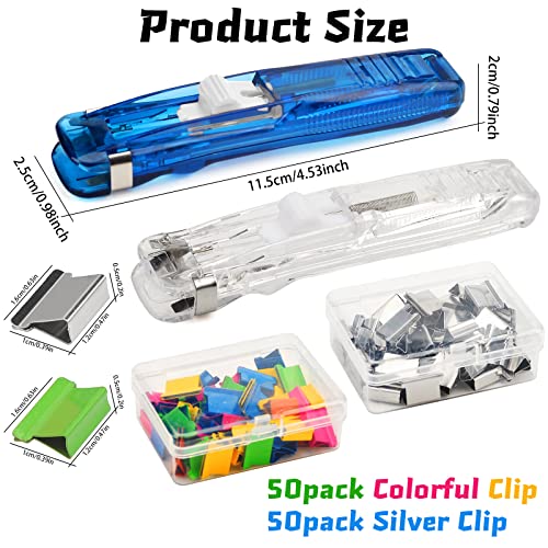 Vibbang 2 Pezzi Riutilizzabile Spillatrici, Morsetto spinta portatile, Portatile Spingere Spillatrici con 100 Clip Riutilizzabili, Clip per raccoglitori per l'Ufficio Scolastico (Blu & Trasparente)