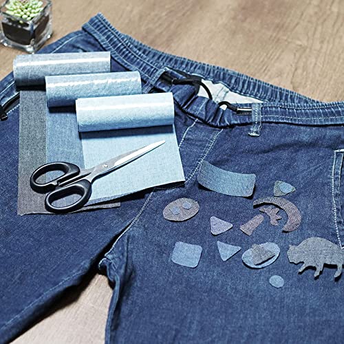 Toppe in denim di grandi dimensioni, 150 x 10,5 cm. Le grandi dimensioni aiutano a riparare fori piccoli e grandi e sono abbastanza grandi da poter creare il proprio design. Il blu si abbina perfettamente ai tuoi vari indumenti. La parte anteriore del cerotto è realizzata in cotone al 100%, mentre il retro è coperto da uno strato più spesso (0,15 mm).