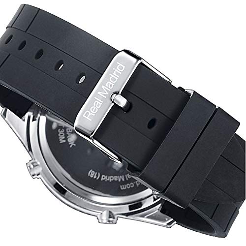 Real Madrid Coperchio posteriore in acciaio inox. Luce, secondo, cronografo, mese, giorno, settimana, allarme, formato 12/24 ore. Movimento: Quarzo Diametro cassa: 48 mm. Materiale cinturino: silicone.
