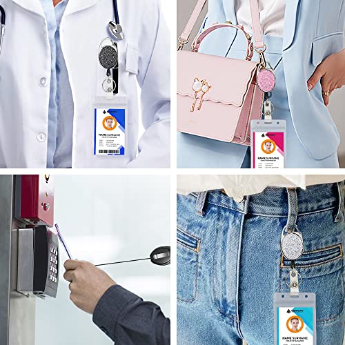 PACCHETTO INCLUSO: bobine di badge retrattili bling 3 pezzi, 3 diversi colori vivaci con 3Pcs PVC porta badge verticali in plastica trasparente, puoi coordinarti con il tuo outfit.