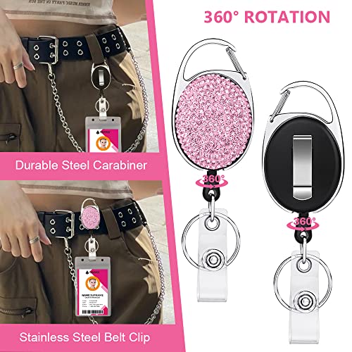 METRIAL DI ALTA QUALITÀ: adottato lo strass a spillo di alta qualità che ha reso l'oggetto più bling. La bobina per badge è in metallo cromato con coperture in plastica resistente, clip per moschettone che facilita il fissaggio a passanti per cintura, zaino, borsa e altri oggetti.