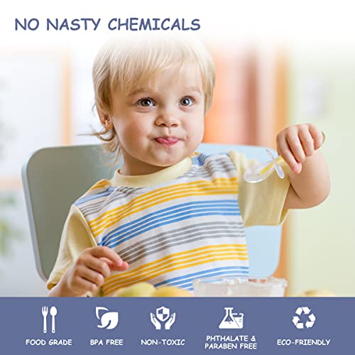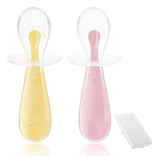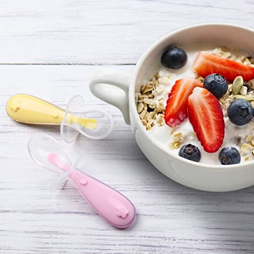 Vicloon Cucchiaino Svezzamento, 2 Pezzi Cucchiaino Silicone Neonato, Cucchiai per Bambini con Deflettore, Cucchiaini per Alimentazione per Bambini Senza BPA, Lavabili in Lavastoviglie (Rosa e Giallo)