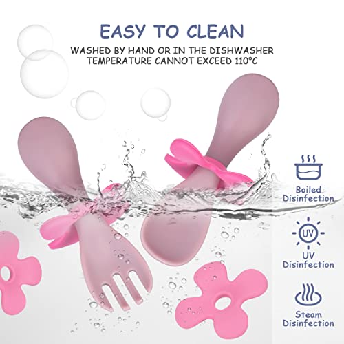 Vicloon Cucchiaio e Forchetta per Bambini, Set di Posate per Bambini con Scatola, cucchiaio e forchetta con deflettore staccabile a Forma di Fiore, Sicuro Quando si Mangia, senza BPA (Rosa)